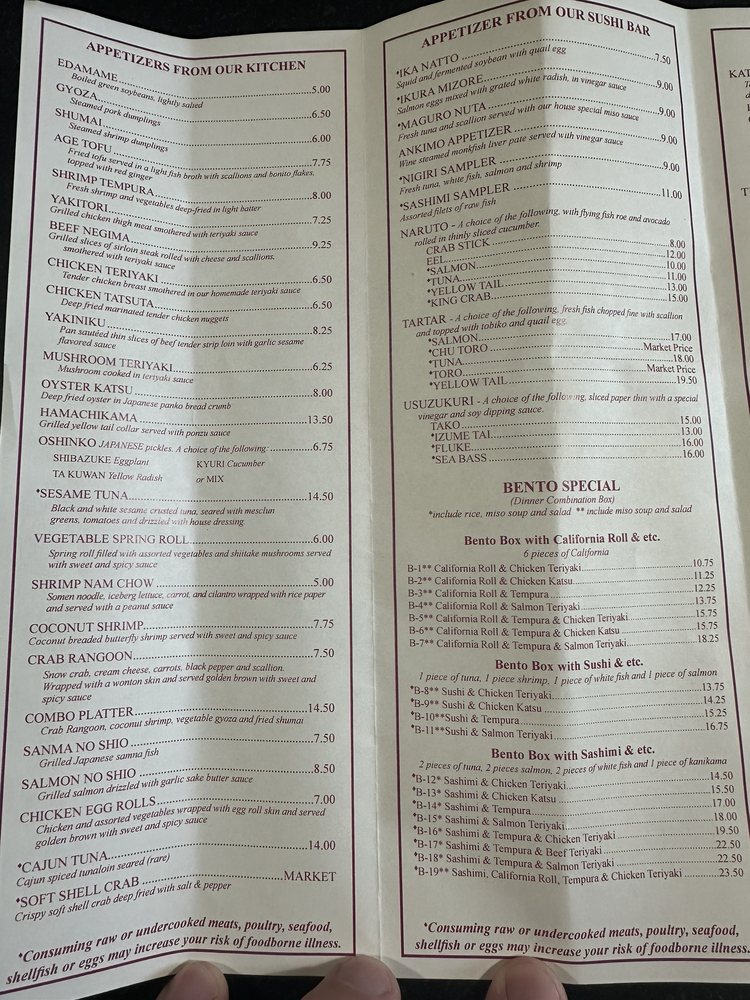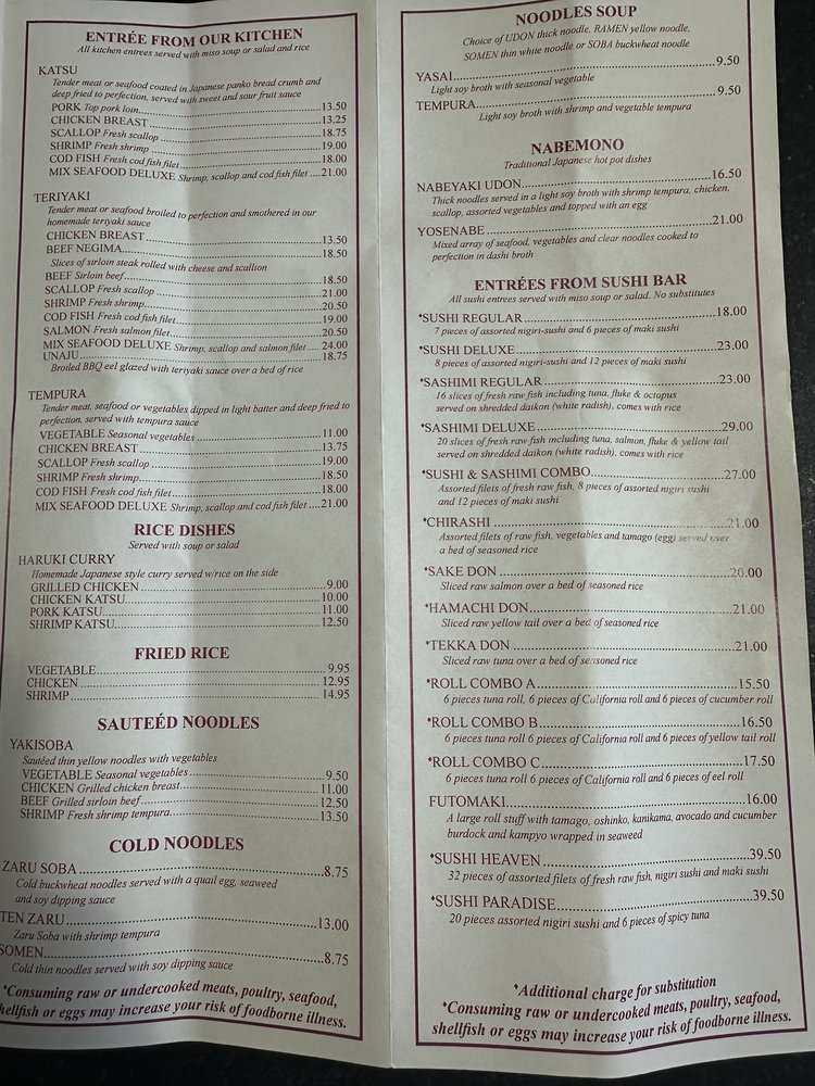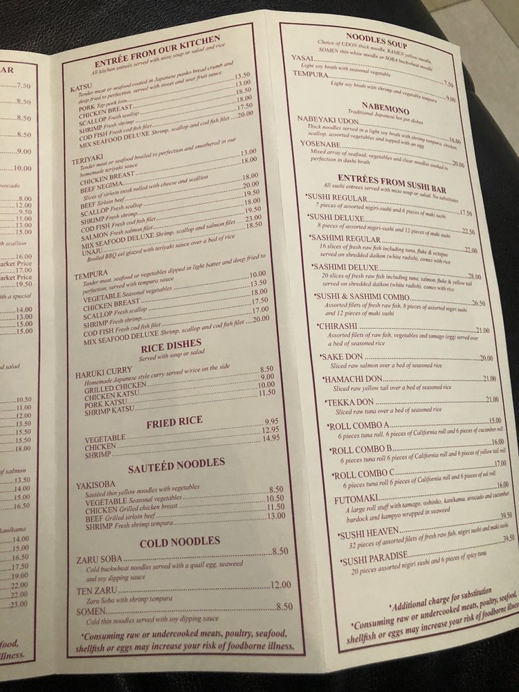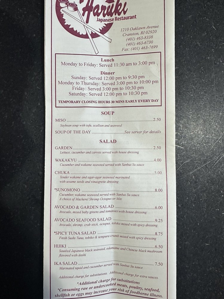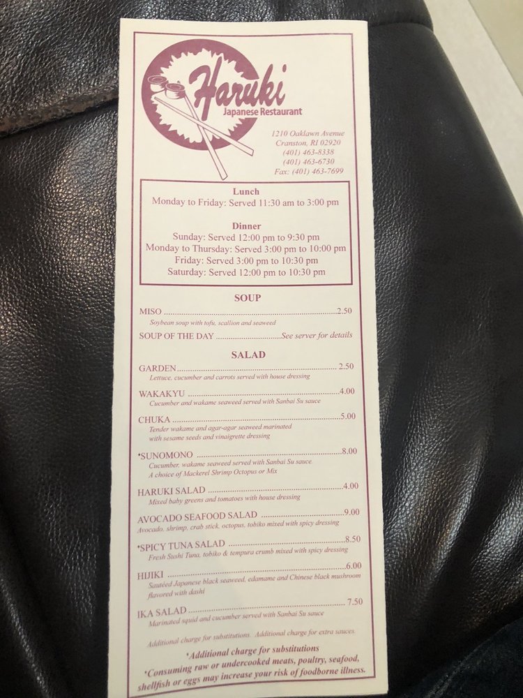 Introducing the menu at Haruki, a Salad - Japanese - Sushi Bars restaurant located at 1210 Oaklawn Ave Cranston, RI 02920. Haruki offers a diverse range of options, including vegan choices, and provides services like reservations, takeout, and delivery. With a casual atmosphere, it is suitable for groups, kids, lunches, and dinners. Customers rave about the fresh flavors, attentive service, and a wide array of sushi options. The dishes like the chicken tempura, chicken teryaki, and California roll bento box have received high praise. The fast service, homemade dressings, and warm rice are standout features. While some dishes may have inconsistent portion sizes, the overall quality, freshness, and deliciousness make up for it. Haruki is a go-to spot for sushi enthusiasts and offers a comfortable dining experience for all.
